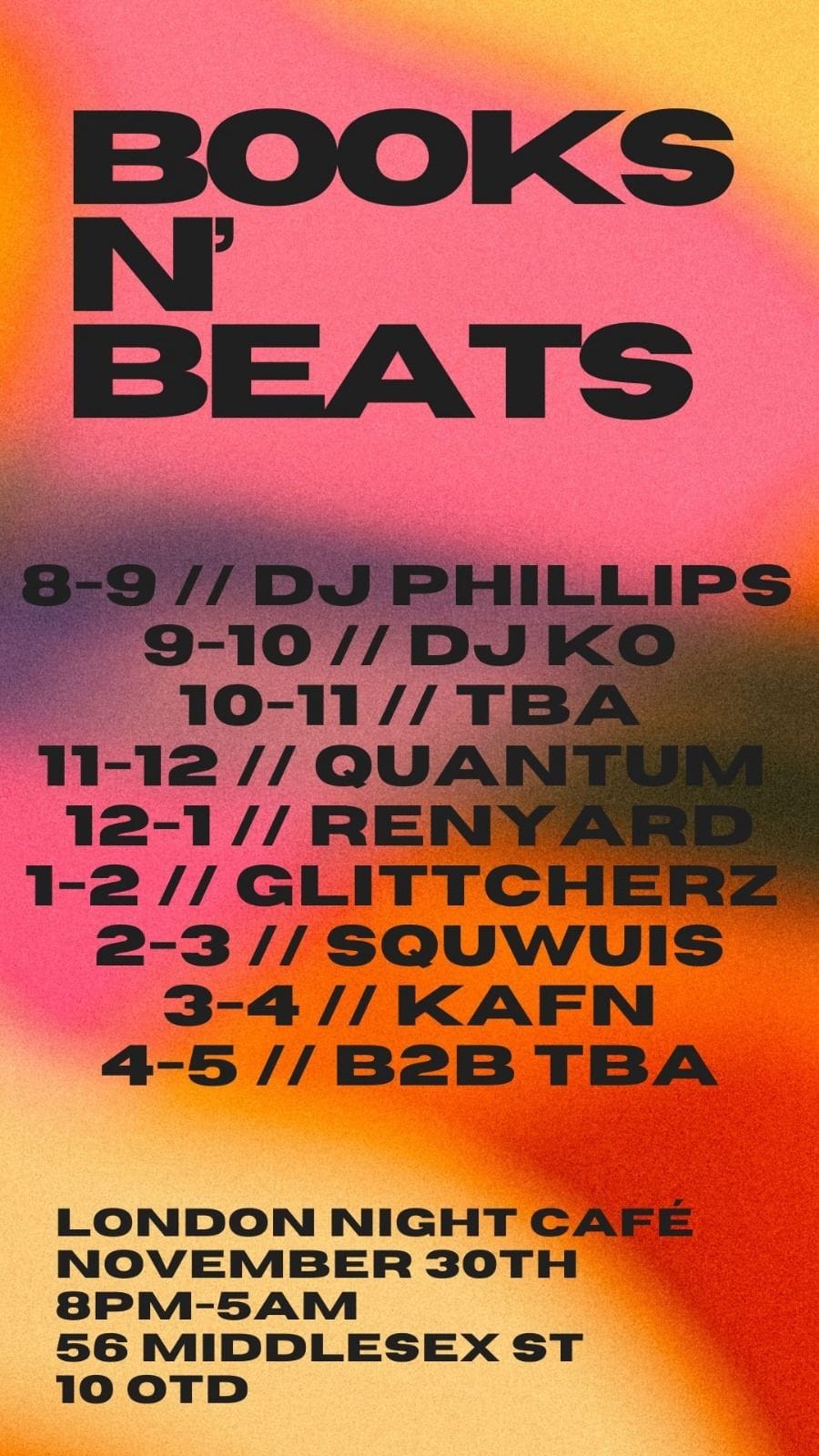 Books N’ Beats will be providing an eclectic soundtrack to the night at London Night Cafe this Saturday 30th November. I’ll be playing from midnight, so expect Acid, Indie Rave and more in the midnight until 1am set.