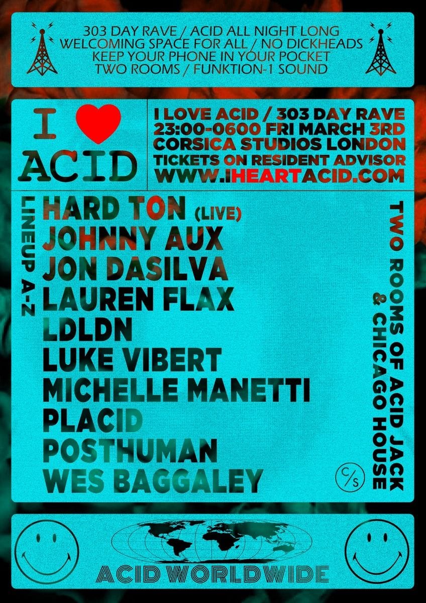 I Love Acid take over Corsica Studios for 303 Day with their biggest line up ever. Their resident lineup is second to none, consisting of Posthuman, Luke Vibert, Jon Dasilva and Placid. They will be joined by a stellar roster of guests with Lauren Flax, Hard Ton, Wes Baggaley, Machelle Manetti, LDLDN and True Pleasures completing the lineup.